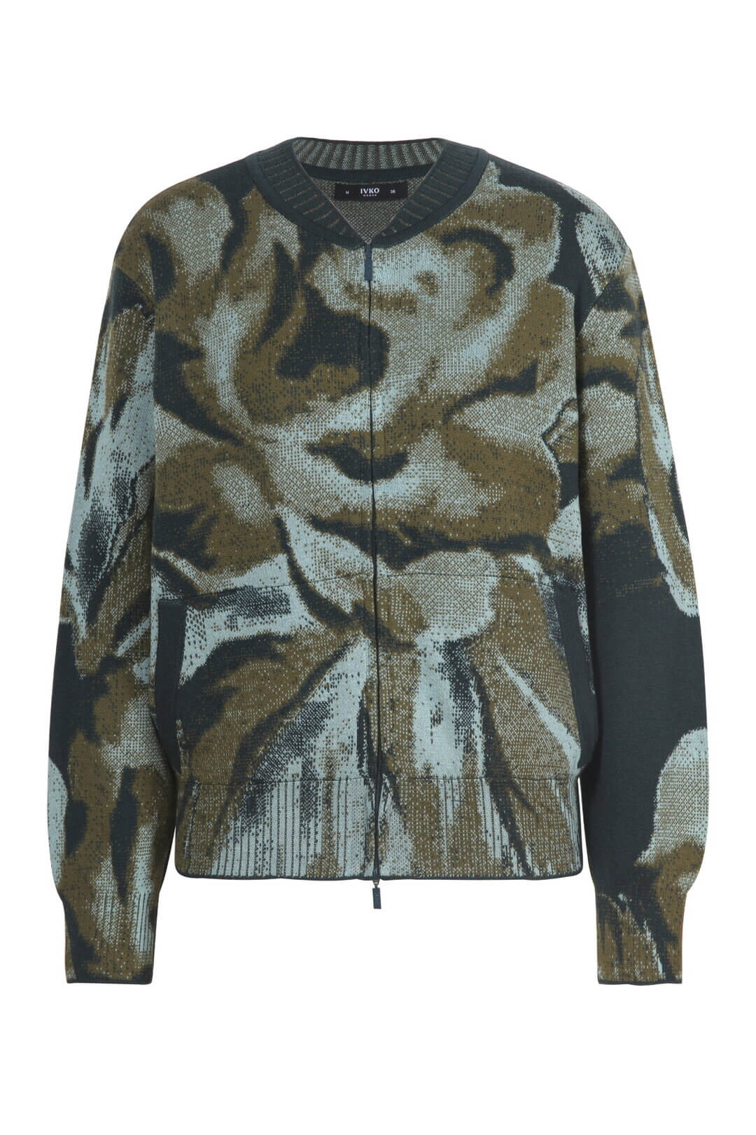 Dit bijzondere gebreide bombervest van Ivko is een echte blikvanger. Het jacquard-patroon in diepe groenen en warme bruintinten doet denken aan een impressionistisch bloemmotief, modern en tijdloos tegelijk. Gemaakt van een zachte wolmix met een comfortabele fit en ritssluiting.