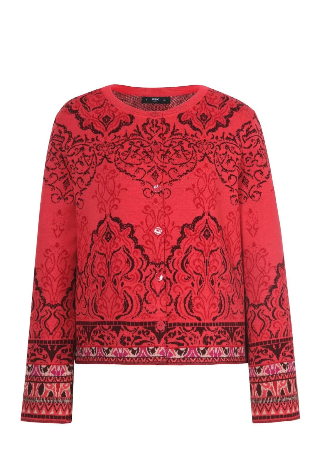 Een opvallend vest van IVKO in een warme koraalrode tint met zwarte jacquard-details. De rijke ornamentprint geeft het ontwerp een luxueuze uitstraling, terwijl de zachte wol zorgt voor draagcomfort en warmte.