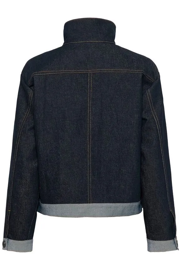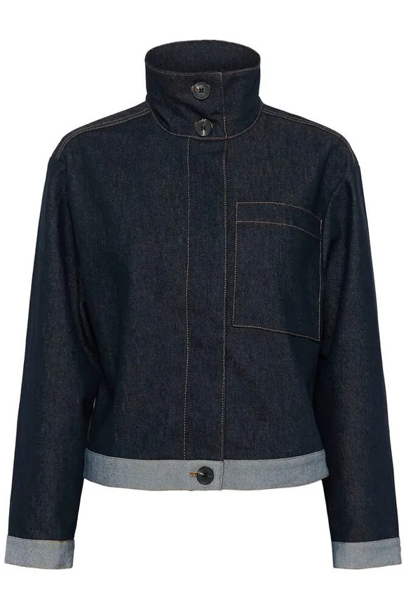 Boxy denim jacket met hoge kraag, korte lengte en een nonchalante, moderne uitstraling.