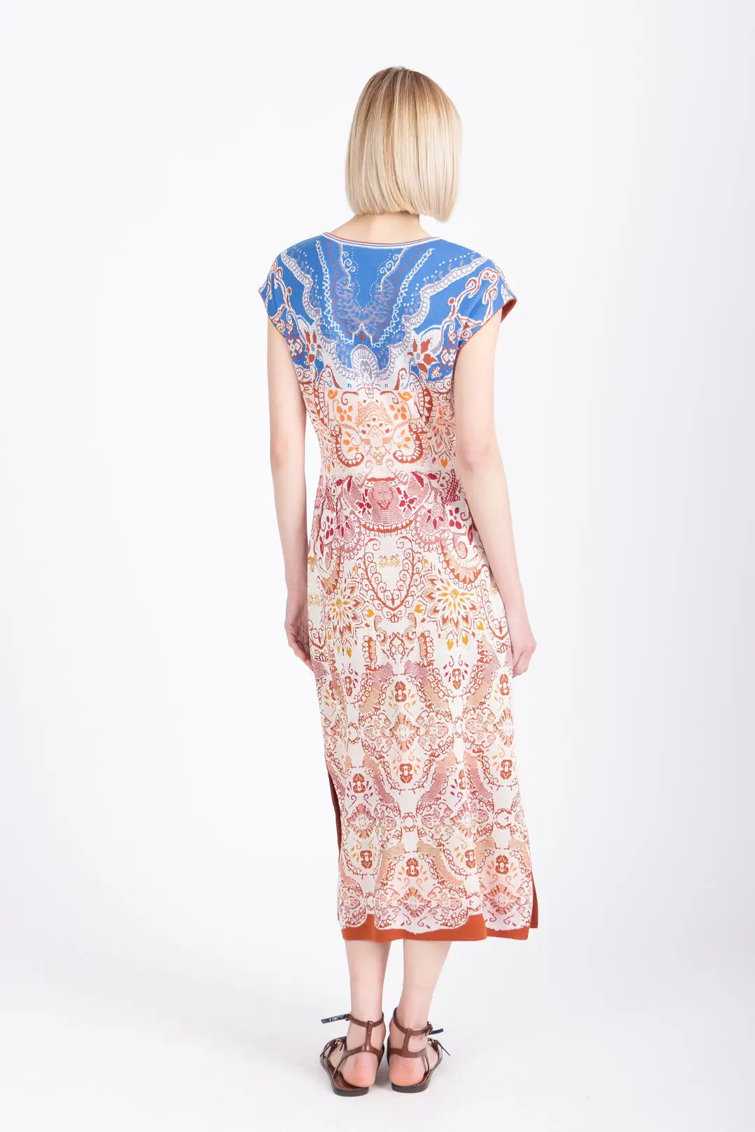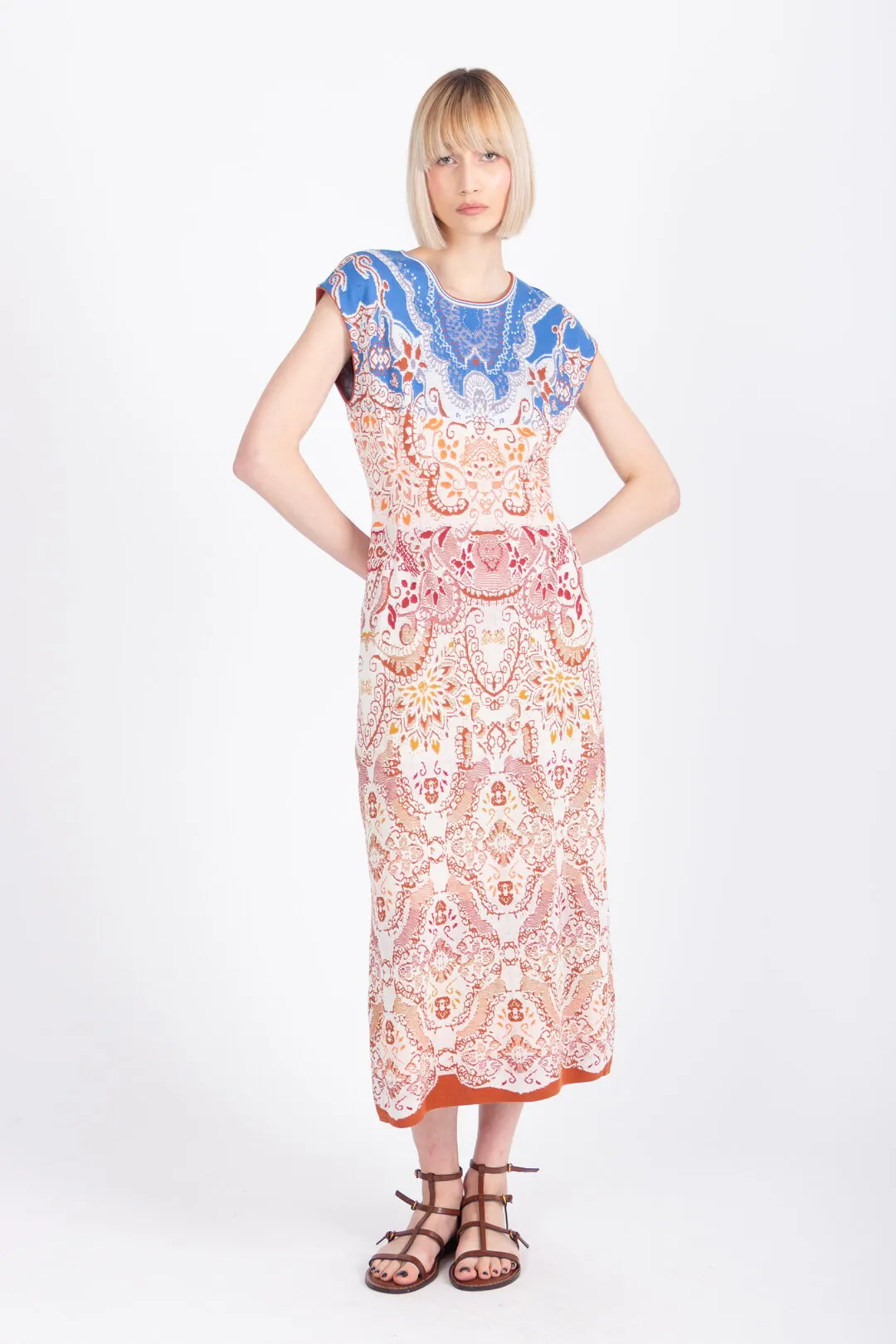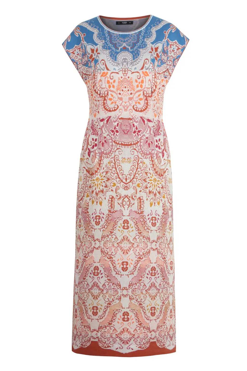 De Ivko jurk ornament pattern is een elegante zomerjurk uit het Mediterrana-thema van Ivko. Het rijke ornamentpatroon is geïnspireerd op mediterrane motieven en geeft de jurk een artistieke en levendige uitstraling. De verfijnde jacquardstructuur zorgt voor subtiele diepte in de kleuren en laat het dessin prachtig tot zijn recht komen.