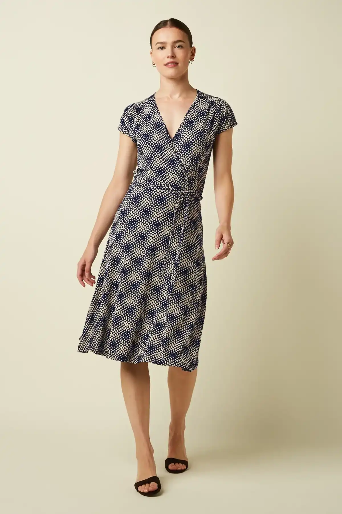 De jurk is gemaakt van LENZING™ ECOVERO™ viscose: duurzaam, ademend en heerlijk soepel. Dankzij de lichte stretch draagt de jurk comfortabel en sluit hij mooi aan zonder strak te voelen. De strikceintuur in de taille zorgt voor een mooi silhouet en geeft je de mogelijkheid om de pasvorm naar wens te stylen.