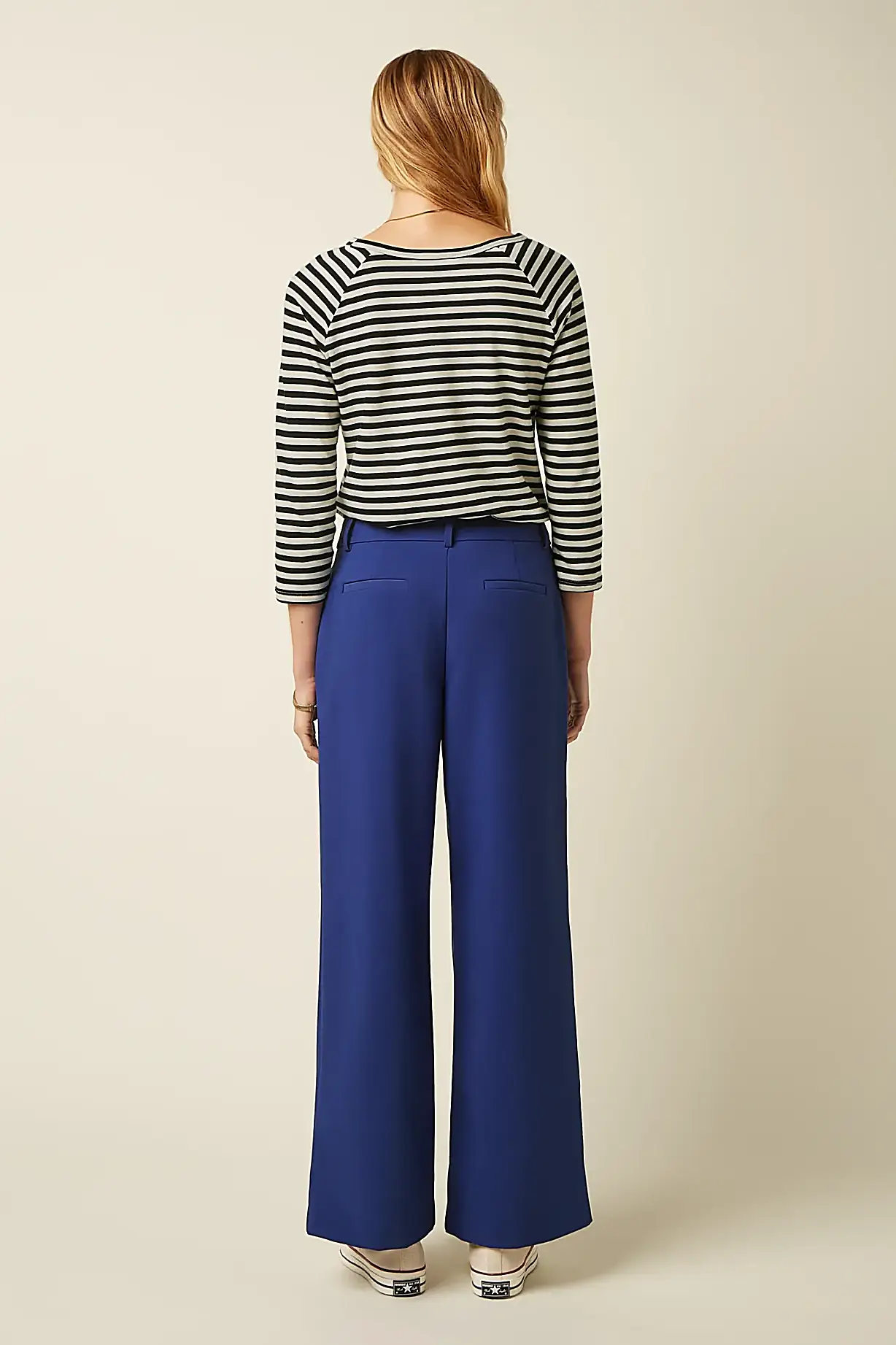 - De broek zit mooi aangesloten in de taille en heupen en valt recht langs het been.