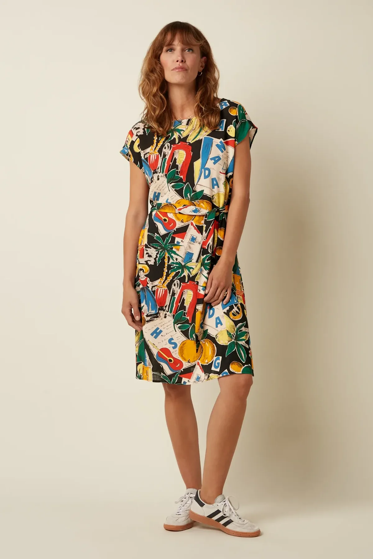 De King Louie Manon jurk Tropez is een speelse en zomerse jurk met een levendige print vol kleur en karakter. De combinatie van grafische elementen, fruit en tropische invloeden geeft deze jurk een unieke uitstraling die direct opvalt.